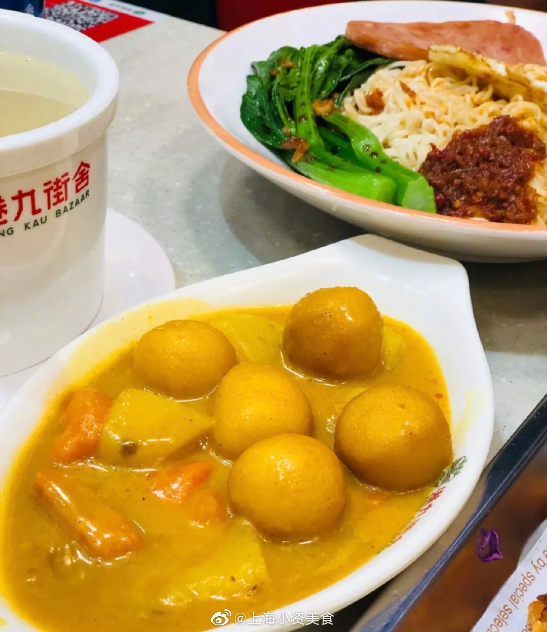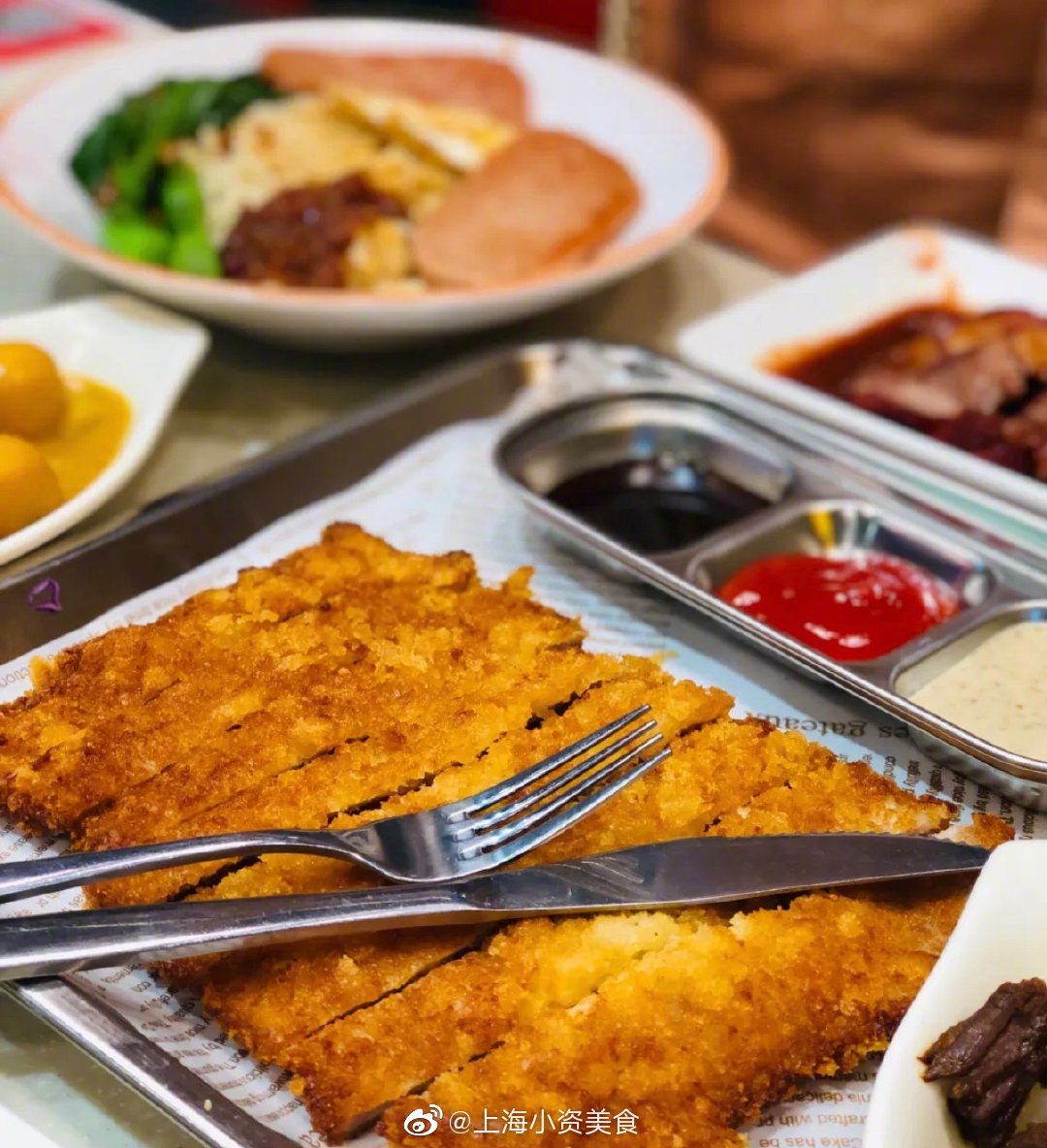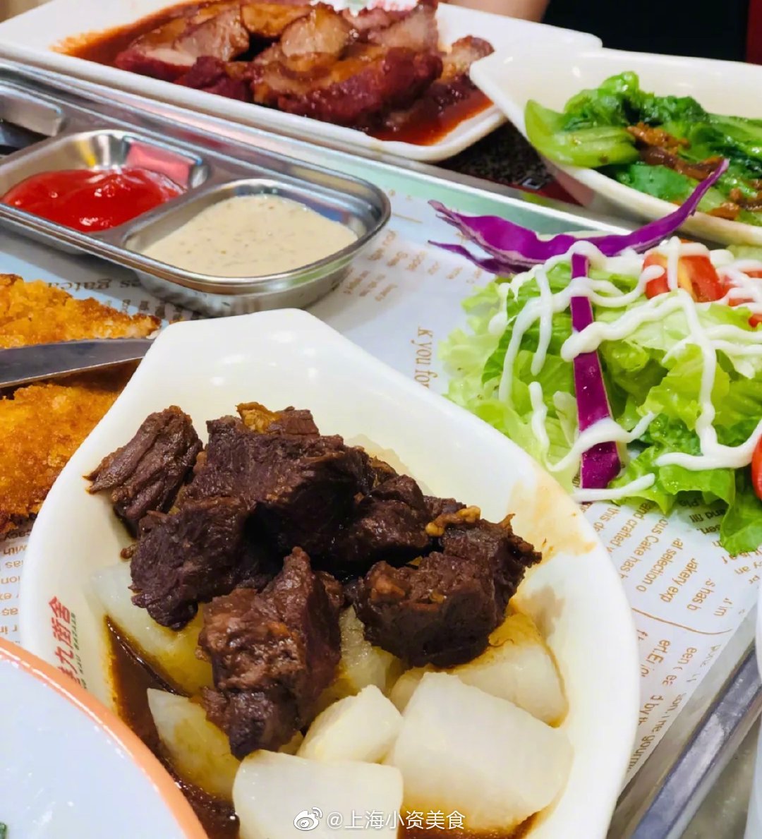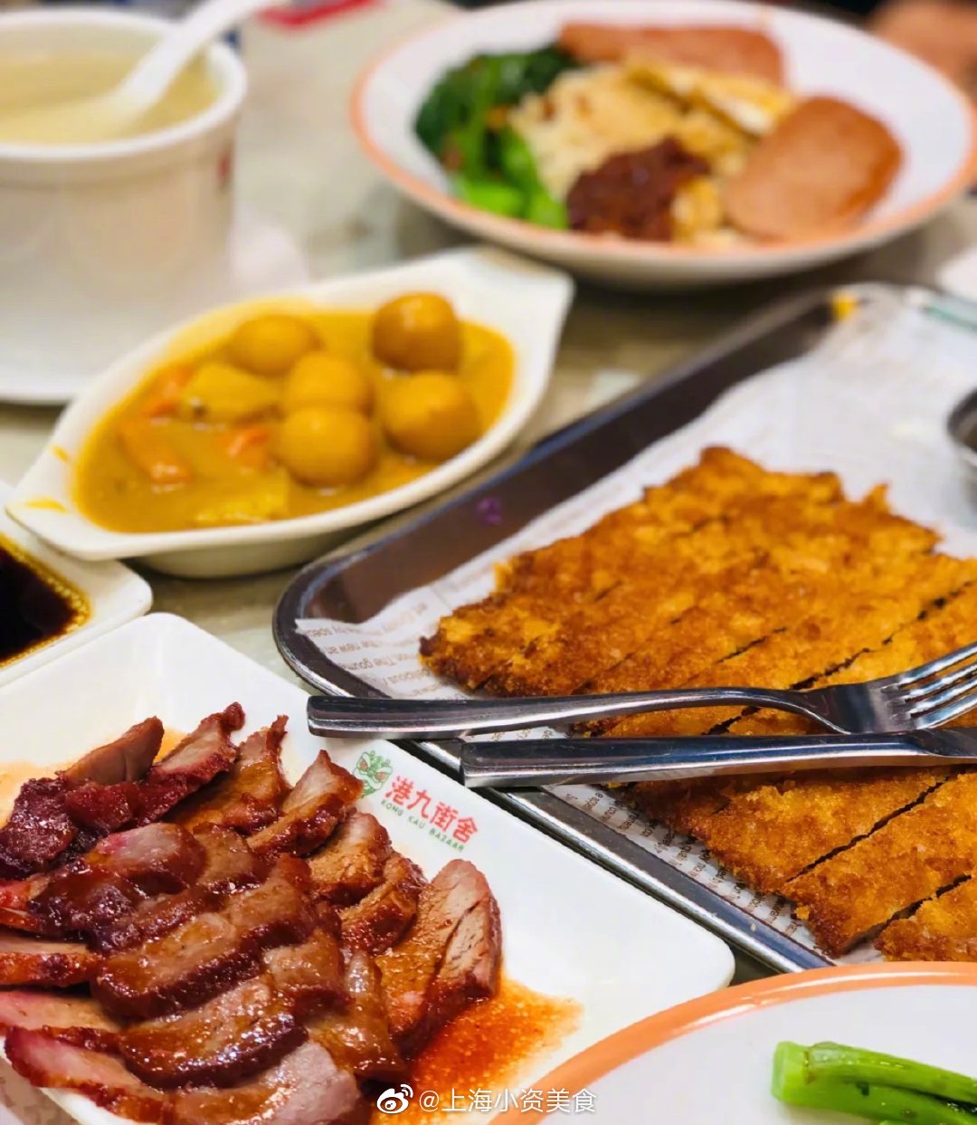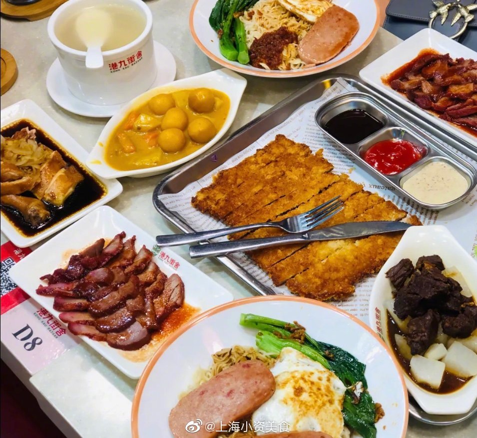 墙裂安利泥萌这家的大脸猪排套餐 !猪排+三种蘸酱+蔬菜沙拉+咖喱+饮品,分量敲足!关键才38元!比脸还大的炸猪排,端上来还是切好的 hin贴心!猪排炸的两面金黄,喷香酥脆!咬起来咔滋咔滋的~肉特别嫩,趁热吃真的有汁水渗出来!配上三种酱料蘸着吃,real解腻,实名pick了!蔬菜沙拉也hin清新爽口!咖喱味道蛮浓郁的,就是稍微有点凉了!车仔面、牛腩饭、丝袜奶茶……小吃种类超多 好吃不贵!本茶餐厅星人疯狂打call!下次还要带姐妹二刷! 上海美食# photo by @赵丫丫是网名吖_ 港九茶餐厅,黄陂南路838号环宇荟B1层B135-1,人均45