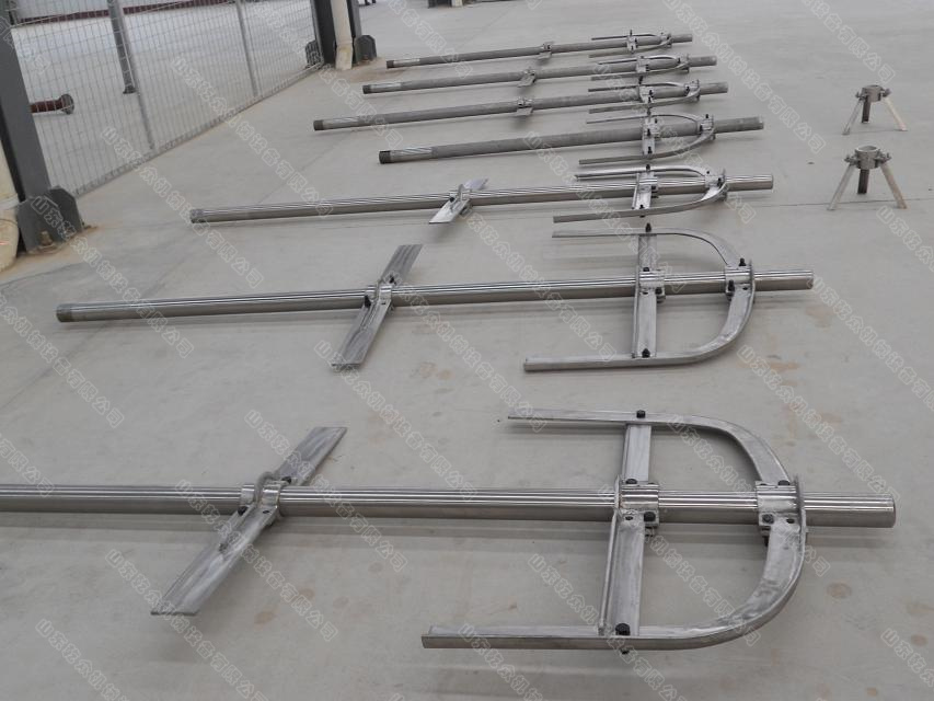 桨式搅拌器的基本构造一般由浆叶、轴环、键、竖轴四部分构成。常用的浆叶一般用普通的扁钢或角钢制造,当被搅拌的介质对钢材有腐蚀性时,使用的材料为不锈钢或有色金属,或者用包覆橡胶、玻璃钢等材料包覆在桨叶的外面。因为搅拌器消耗的功率与桨叶直径的五次方成正比,设计时桨叶不宜过长,一般取容器内径的1/3-2/3。如反应釜内径尺寸过大可设计成两个或多个桨叶、当反应釜直径很大时采用两个或多个桨叶。如果搅拌的物料过深时,可采用两排或多排桨叶,主要适用于粘度小、流动性大或纤维状、结晶状的溶解液。